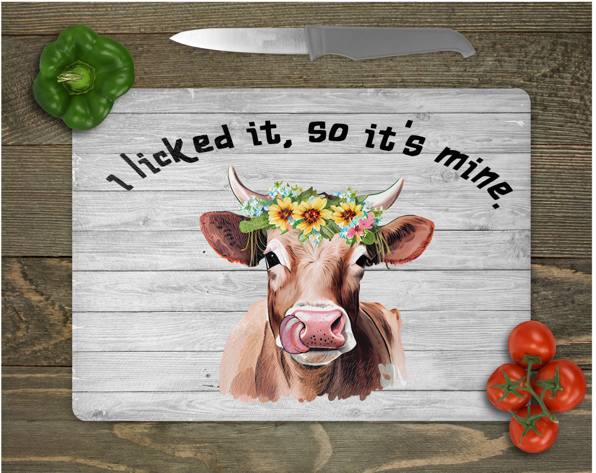 I Licked It So It's Mine, Cow & Sunflowers Tempered Glass Cutting Board, Trivet