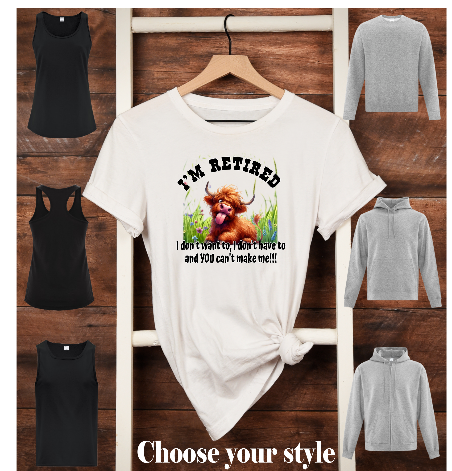 I'm Retired I don't Want To, I Don't have to and You Can't make me, Highland Cow - Adult T-Shirts, Tank Tops, Sweatshirts & Hoodies