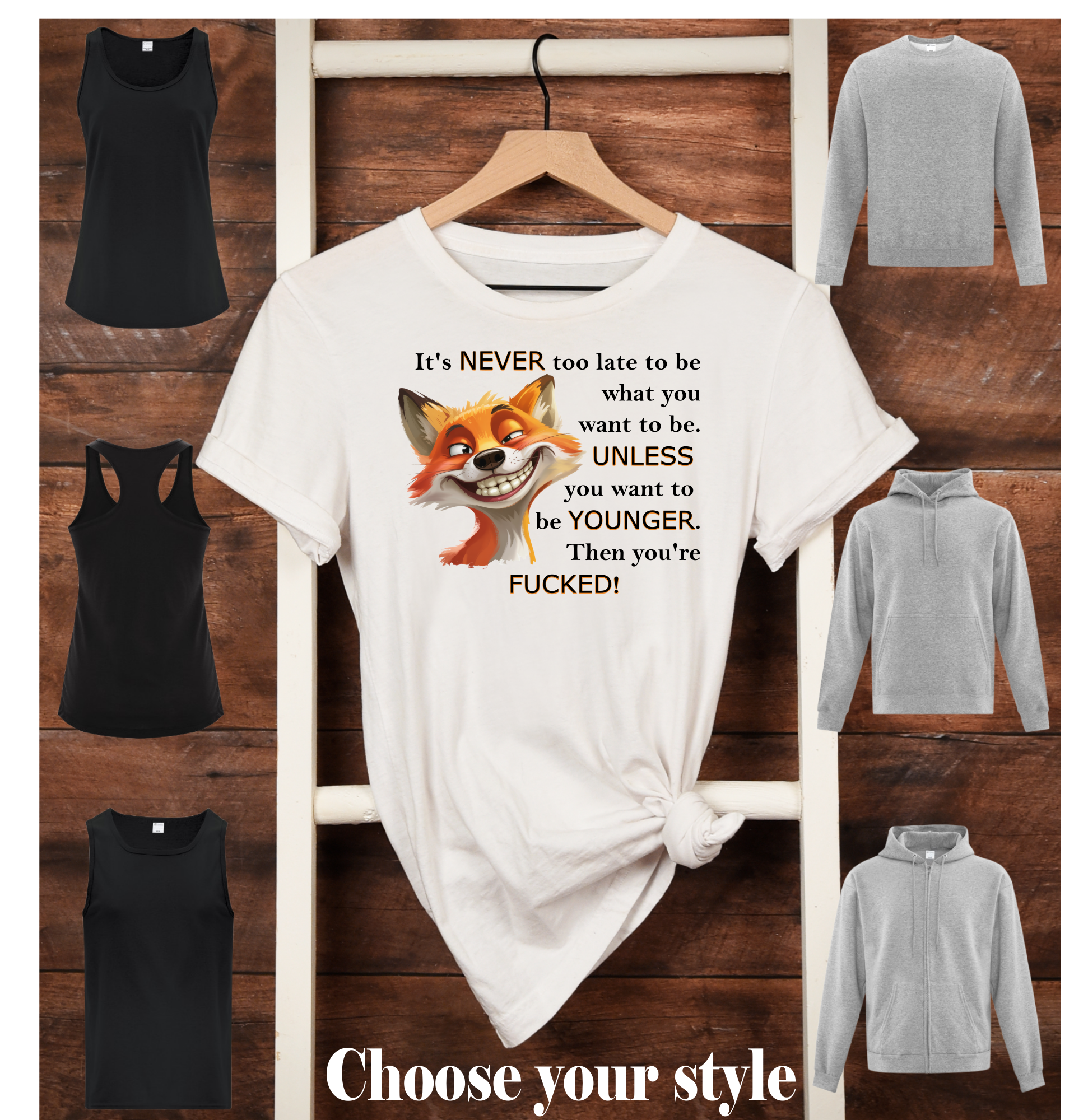 It's Never Too Late To Be What You Want to be, Unless You Want to Be Younger, Then You're Fucked, Fox - Adult T-Shirts, Tank Tops, Sweatshirts & Hoodies